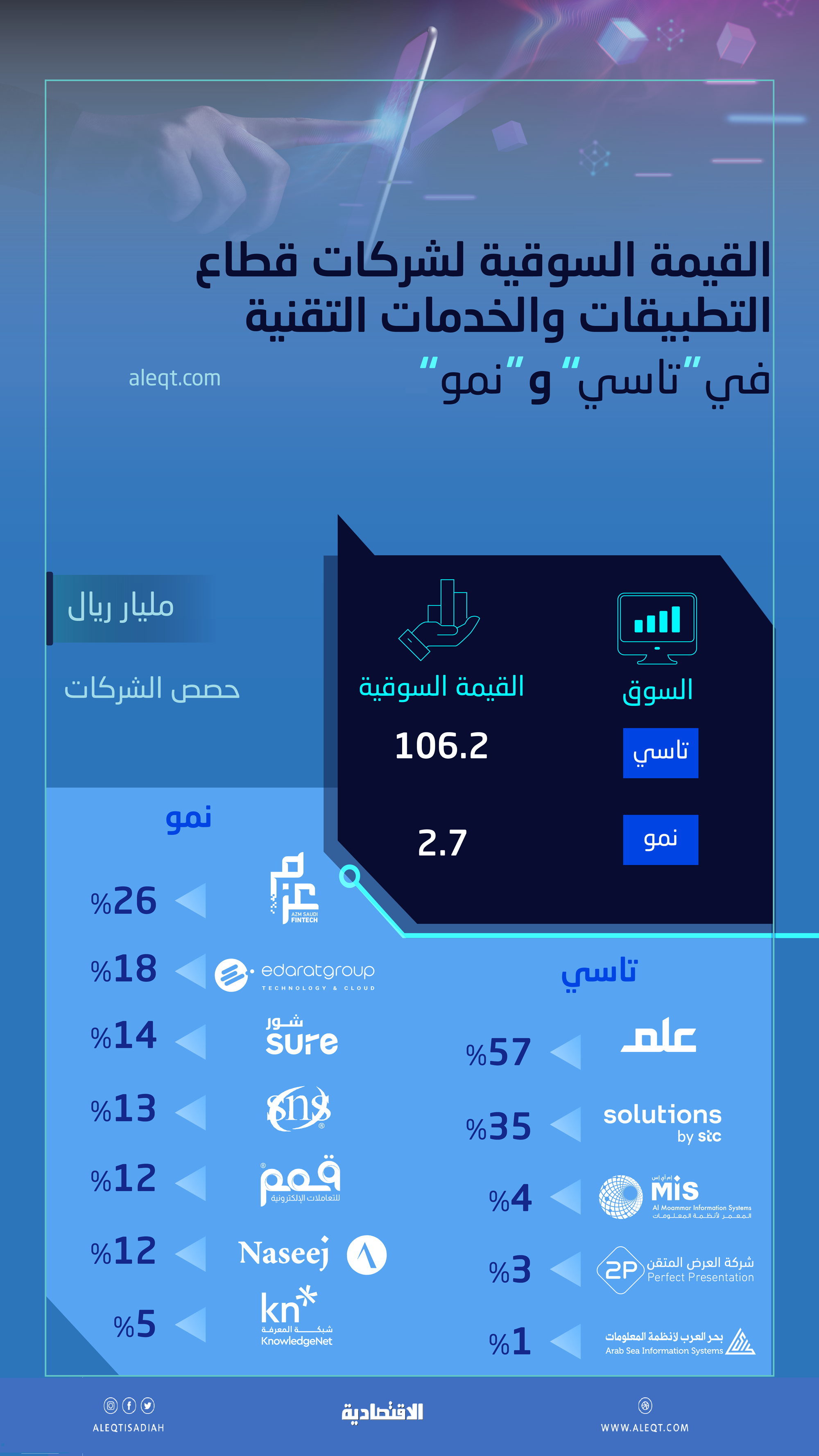 وتعمل «سلوشنز»، التي تأسست عام 2003، في قطاعات تقنية المعلومات والاتصالات والشبكات، وتبلغ قيمتها السوقية حاليًا نحو 27.1 مليار ريال، فيما تمتلك شركة الاتصالات السعودية الحصة الأكبر من رأس المال بنسبة 79%.