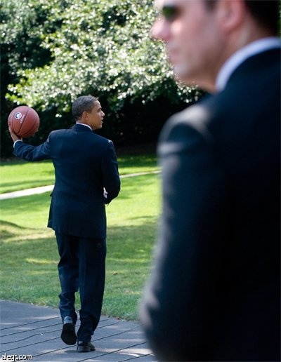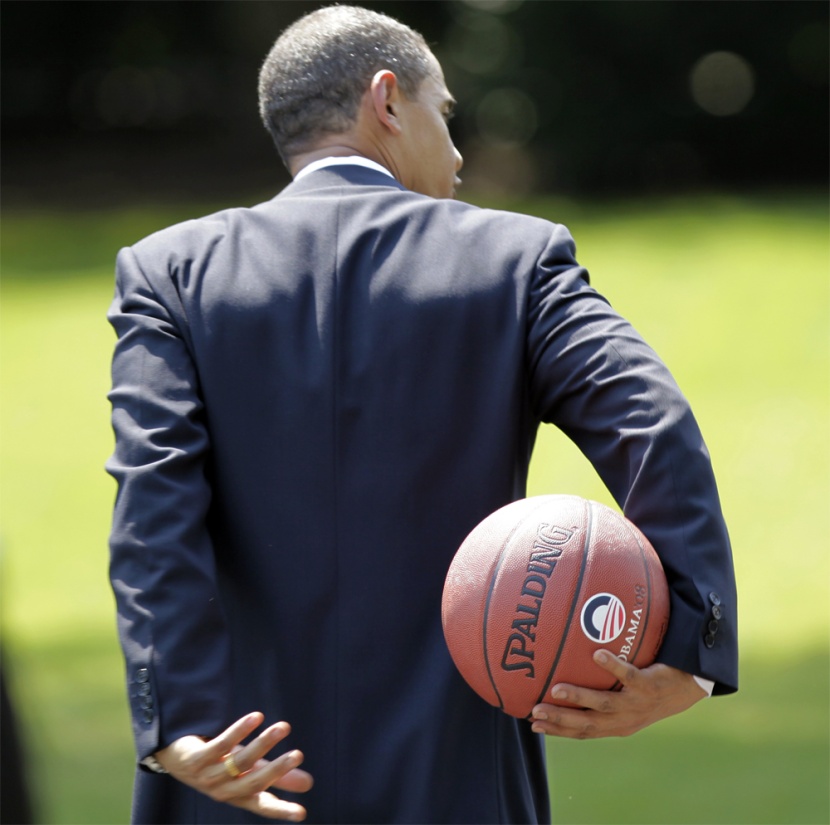 الرئيس الأمريكي باراك أوباما يستعرض بعض المهارات في البيت الأبيض بعد استقباله فريق ديترويت النسائي لكرة السلة الحائز على بطولة W