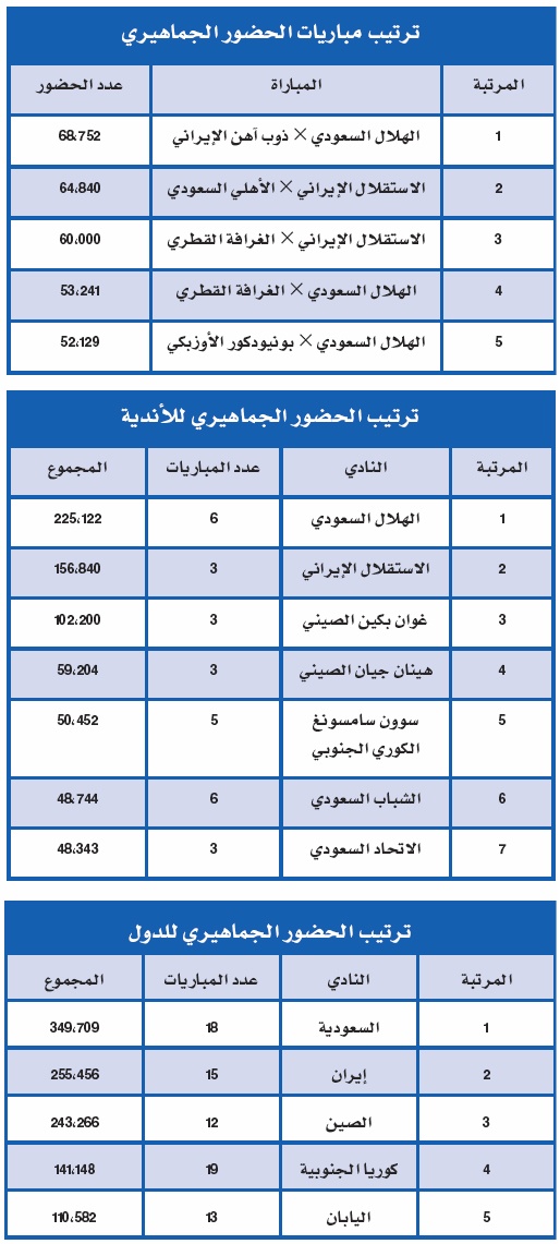 وجاءت جماهير الاستقلال الإيراني في المرتبة الثانية بـ 156 ألفا و840 مشجعا، ثم جماهير جوان بكين الصيني بـ 102200 مشجع.