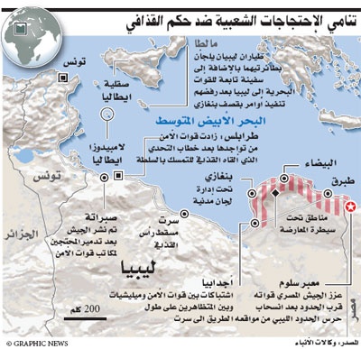وأمس، أعلن وزير الخارجية الايطالي فرانكو فراتيني في روما، أن إقليم برقة، أي المناطق الشرقية من ليبيا والتي تضم خصوصا بنغازي والبيضاء ودرنة، لم يعد خاضعا لسيطرة حكومة معمر القذافي.