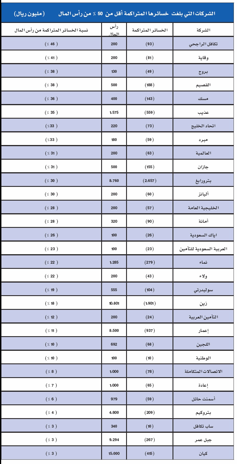 أما بخصوص باقي الشركات التي تسجل خسائر متفاوتة من رأس المال، ولكنها أقل من 50 في المائة، فقد بلغت عدد الشركات التي سجلت خسائر أقل من 50 في المائة 31 شركة تندرج تحت قطاعات مختلفة منها 13 شركة من شركات قطاع التأمين.