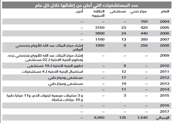 ووفقا لرصد وحدة التقارير في صحيفة "الاقتصادية" على بيانات الميزانية العامة للدولة منذ عام 2004 حتى عام 2017، بلغ عدد المستشفيات التي تم بنائها 138 مستشفى، إضافة إلى 1640 مركزا للرعاية الصحية الأولية.