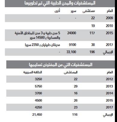 وبحسب الرصد، بلغ عدد المستشفيات التي تم تطويرها وإحلال البنية التحتية فيها، 196 مستشفى بطاقة سريرية تصل إلى 33.1 ألف سرير، إضافة إلى سبع مدن طبية وثلاث مدن طبية عسكرية أمنية بطاقة سريرية تبلغ 16.85 ألف سرير، وذلك خلال الأعوام (2009 و 2010 و 2015 و 2017).