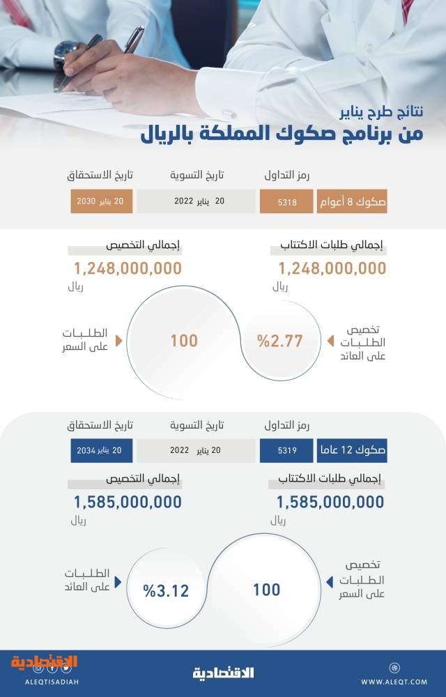 وتوزع إصدار شهر يناير، الذي تجري تسويته الخميس، على شريحتين وبواقع "عائد" للصكوك ذات أجل 12 عاما عند 3.12 في المائة، وذلك وفقا لسعر الإصدار عند 1000 ريال، وجاء العائد حتى تاريخ الاستحقاق للصكوك ذات ثمانية أعوام عند 2.77 في المائة بسعر طرح 1000 ريال وهي القيمة الاسمية.