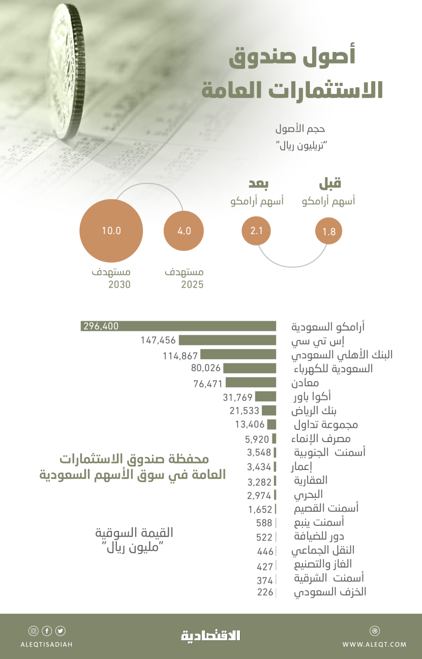 ويبلغ نصيب أسهم الصندوق في أرامكو 296.4 مليار ريال، وذلك بحسب إغلاق جلسة الأحد، في حين تشكل أسهم أرامكو نحو 3 في المائة من إجمالي قيمة محفظة الصندوق بالأسهم المحلية.