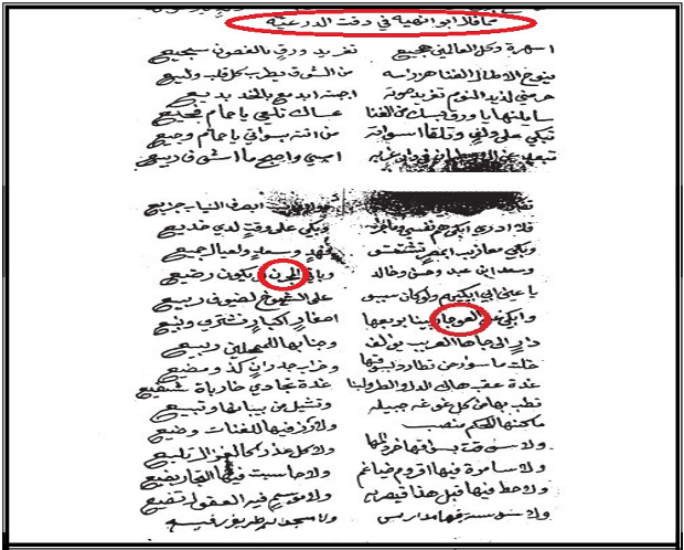 ومن الشواهد الفصيحة التي تدل دلالة واضحة على أن المقصود بالعوجا الدرعية قول الشاعر أحمد بن دعيج «ت 1268هـ» في أرجوزته الشهيرة بعد دمار الدرعية: