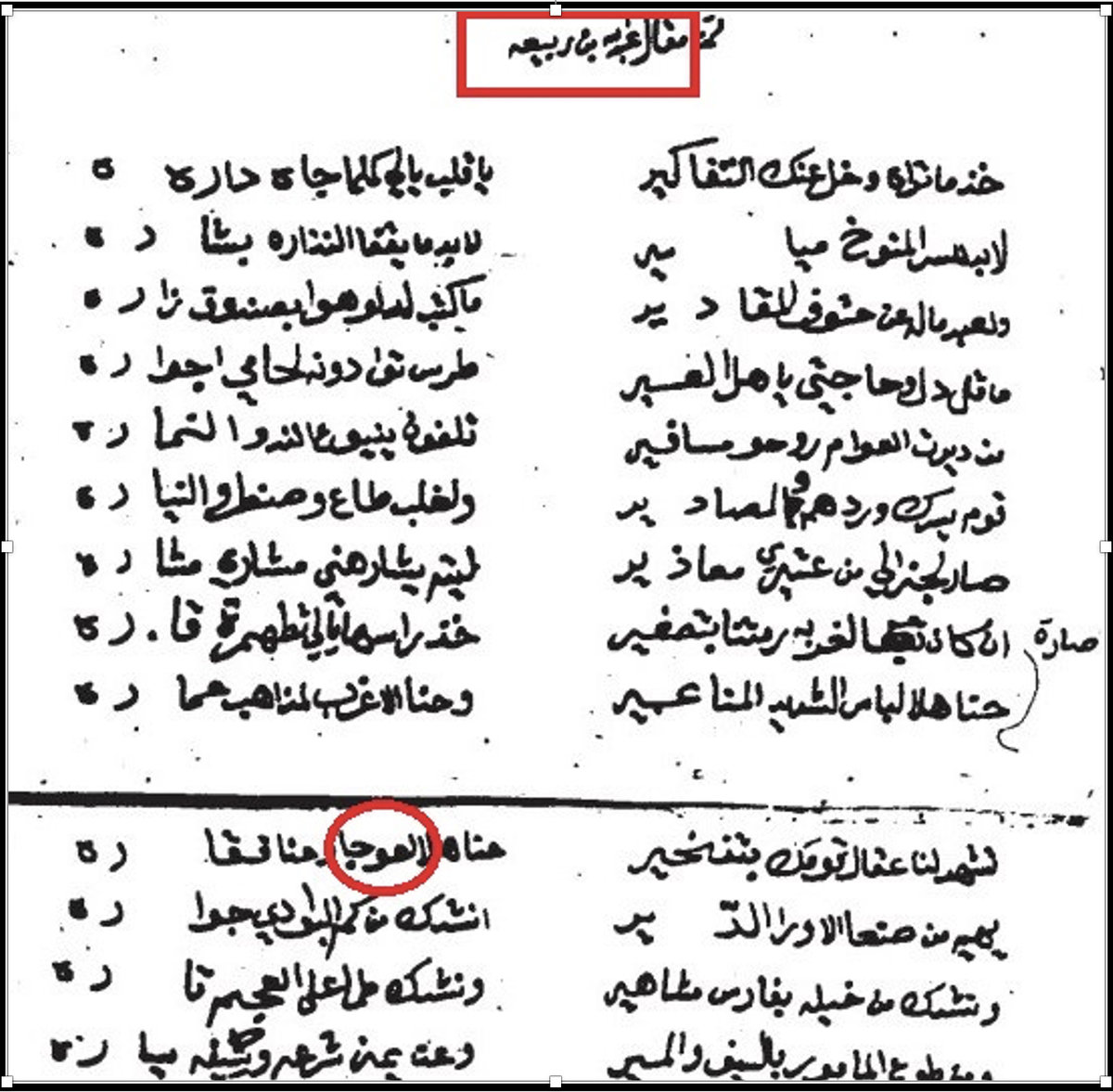 فهي هنا ترسل منجوبة إلى الدرعية التي عبرت عنها بلفظ «العوجا» ووصفتها بـ»ديرة الشيخ» أي بلد الحاكم، وهو في ذلك الحين الإمام عبدالله بن سعود آخر حكام الدولة السعودية الأولى. وقال الشاعر عبدالله بن خالد من أهالي الدرعية متحدثا عن حصار المدينة والحرب حولها مع جيوش محمد علي عام 1233هـ: