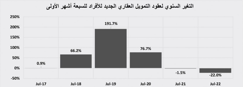 وجاءت تلك النسب من الانخفاض خلال الفترة لكل من إجمالي التمويل العقاري السكني وأعداد العقود التمويلية، امتدادا لتباطؤ نمو الإقراض العقاري منذ منتصف العام الماضي، حيث سجل إجمالي التمويل العقاري السكني انخفاضا سنويا بنهاية تموز (يوليو) بمعدل وصل إلى 23.2 في المائة، مقارنة بمستواه المسجل للشهر نفسه من العام الماضي، واستقر مع نهاية الشهر عند أدنى من مستوى 7.4 مليار ريال، وهو أدنى مستوى شهري له منذ سبتمبر 2019. كما انخفض إجمالي عدد عقود التمويل العقاري بمعدل سنوي بلغ 29.1 في المائة، واستقر مع نهاية الشهر عند مستوى 9.2 ألف عقد تمويلي، الذي يعد أدنى مستوى شهري له منذ يوليو 2019. وقد انعكس استمرار ذلك الانخفاض في حجم التمويل العقاري على نشاط السوق العقاري في القطاع السكني، الذي سجل خلال الفترة نفسها تباطؤا في النمو السنوي لإجمالي قيمة صفقاته إلى 5.2 في المائة بنهاية الأشهر السبعة الأولى من العام الجاري، وسجل تراجعا سنويا خلال الفترة في كل من عدد صفقات القطاع السكني بنسبة 22.6 في المائة، وفي حجم المبيعات السكنية بنسبة انخفاض بلغت 23.2 في المائة.
