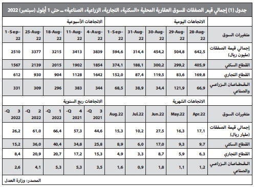 أنهت السوق العقارية أداءها خلال أغسطس على انخفاض سنوي في إجمالي قيمة صفقاتها بنسبة 4.6 في المائة، واستقرت على أثره عند مستوى 15.3 مليار ريال، مقارنة بمستواها خلال الشهر نفسه من العام الماضي عند مستوى 16.1 مليار ريال. وشمل الانخفاض السنوي جميع القطاعات الرئيسة للسوق، حيث انخفض القطاع السكني بنسبة 4.4 في المائة، وانخفض القطاع التجاري بنسبة 10.1 في المائة، بينما ارتفع إجمالي القطاعين الزراعي والصناعي بنسبة 16.7 في المائة.