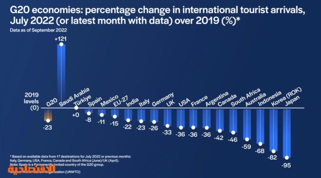 حيث احتلت المملكة مرتبة أول دولة في مجموعة العشرين تحقق نمو إيجابي للقطاع السياحي من آثار جائحة كورونا.