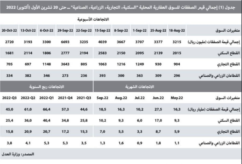 سجلت قيمة صفقات القطاع السكني انخفاضا قياسيا 20.5 في المائة، استقرت على أثره عند أدنى من مستوى 1.7 مليار ريال "61.8 في المائة من إجمالي قيمة الصفقات الأسبوعية للسوق العقارية"، وانخفض إجمالي قيمة صفقات القطاعين الزراعي والصناعي 12.4 في المائة، واستقر عند 334 مليون ريال "12.3 في المائة من إجمالي قيمة الصفقات الأسبوعية للسوق العقارية". بينما ارتفعت قيمة صفقات القطاع التجاري بعد أسبوعين متتاليين من الانخفاض، مسجلة ارتفاعا لم يتجاوز 1.2 في المائة، واستقرت على أثره عند 705 ملايين ريال "25.9 في المائة من إجمالي قيمة الصفقات الأسبوعية للسوق العقارية".