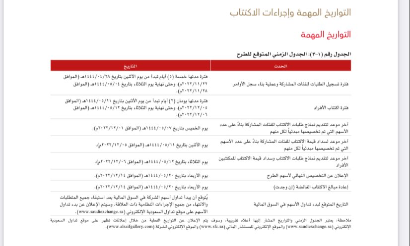وستمتد فترة الطرح للفئات المشاركة لمدة 5 أيام تبدأ من يوم الإثنين 22 نوفمبر الجاري، في حين تبدأ فترة الإكتتاب للأفراد يوم 5 ديسمبر المقبل ولمدة يومين.