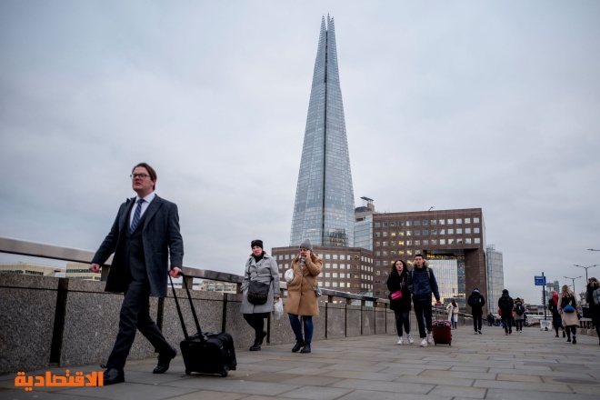 مشاة يعبرون جسر لندن مع الحي المالي وسط مدينة لندن. وقد يكون الركود المتوقع في بريطانيا ضعف السوء الذي كان يُعتقد سابقا وفقا لشركة EY للاستشارات، وتشير توقعات خبراء اقتصاديين إلى أن الاقتصاد البريطاني يزداد سوءا بسبب قلة الدعم الحكومي وارتفاع الضرائب، "الألمانية".