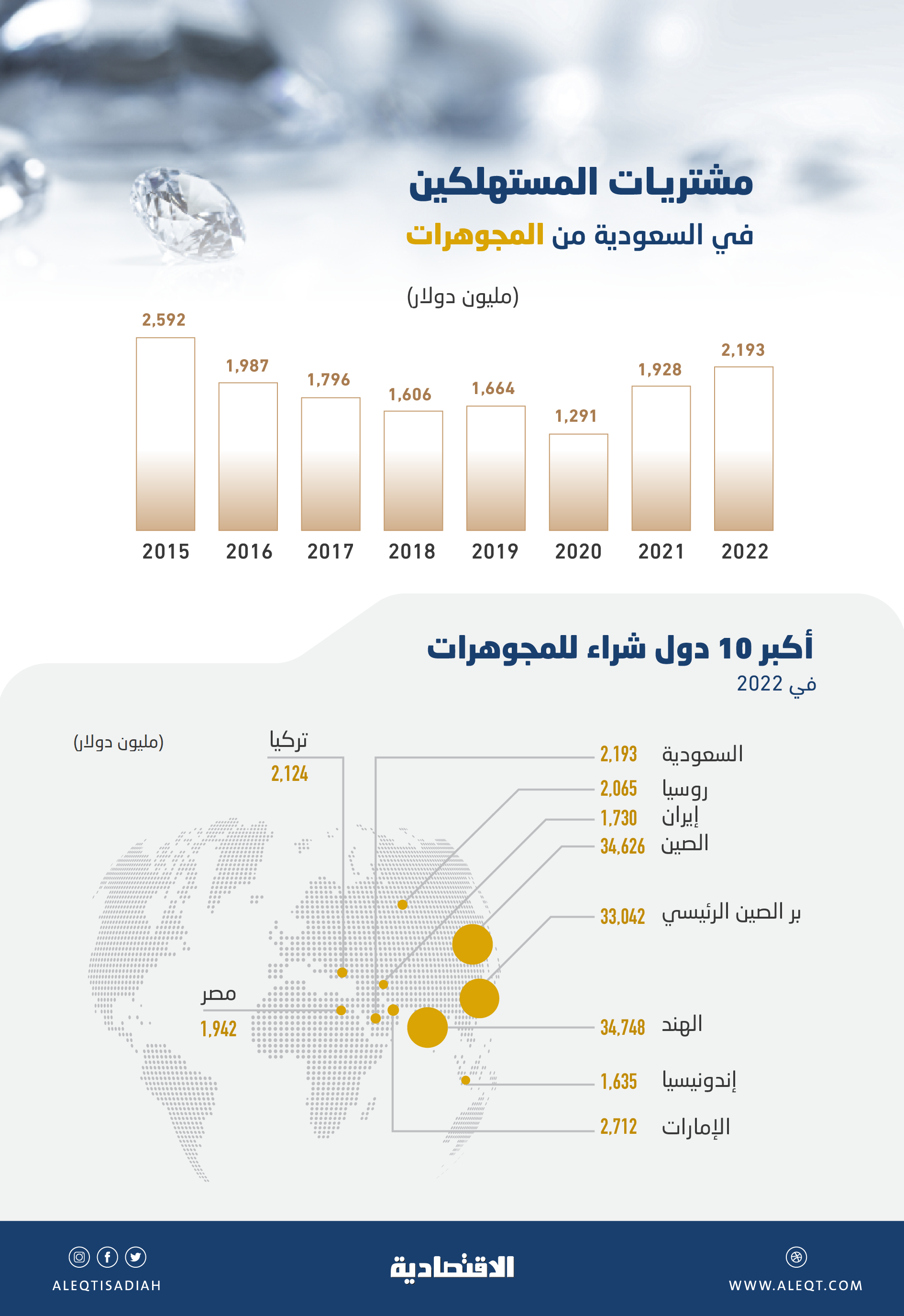 وشكل إجمالي مشترياتهم "مجوهرات بجانب سبائك وعملات ذهبية" 1.8 في المائة من الإجمالي العالمي البالغ 191.2 مليار دولار، احتلوا بها المركز العاشر عالميا.