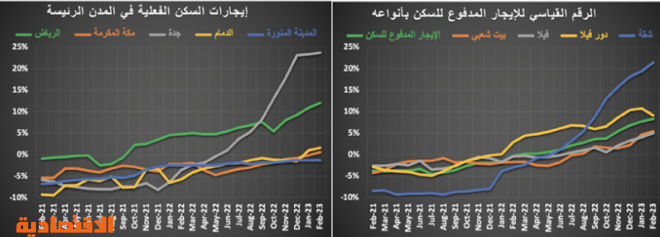 التضخم وإيجارات السكن حسب أنواع العقارات والمدن - فبراير 2023