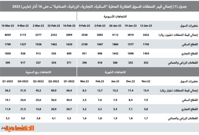 كما سجلت قيمة صفقات القطاع السكني ارتفاعا أسبوعيا جيدا بنسبة 34.9 في المائة، مقارنة بانخفاضه القياسي خلال الأسبوع الأسبق بنسبة 31.5 في المائة، مستقرا بنهاية الأسبوع الماضي عند مستوى 1.8 مليار ريال. في المقابل سجل إجمالي قيمة صفقات القطاعين الزراعي والصناعي انخفاضا قياسيا بنسبة بلغت 56.5 في المائة، واستقر بدوره إجمالي صفقات القطاعين عند أدنى من مستوى 0.4 مليار ريال. وعلى مستوى بقية مؤشرات أداء السوق العقارية خلال الأسبوع الماضي، سجل عدد الصفقات العقارية انخفاضا أسبوعيا بنسبة 17 في المائة، واستقر مع نهاية الأسبوع عند أدنى من مستوى ثلاثة آلاف صفقة، وانخفض أيضا عدد العقارات المبيعة بنسبة بلغت 16.6 في المائة، واستقر حجم المبيعات الأسبوعية للسوق عند مستوى 3.2 ألف عقار مبيع، كما سجل إجمالي مساحة الصفقات العقارية انخفاضا قياسيا بنسبة بلغت 32.2 في المائة، واستقر الإجمالي مع نهاية الأسبوع الماضي عند مستوى 32.1 مليون متر مربع.