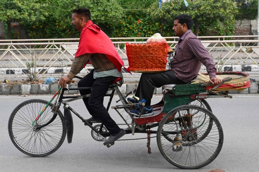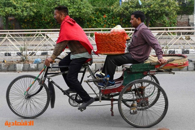 هنديان على دراجة يحملان مواد غذائية في طريقهما إلى السوق لبيعها، في أمريتسار، البنجاب."الفرنسية"
