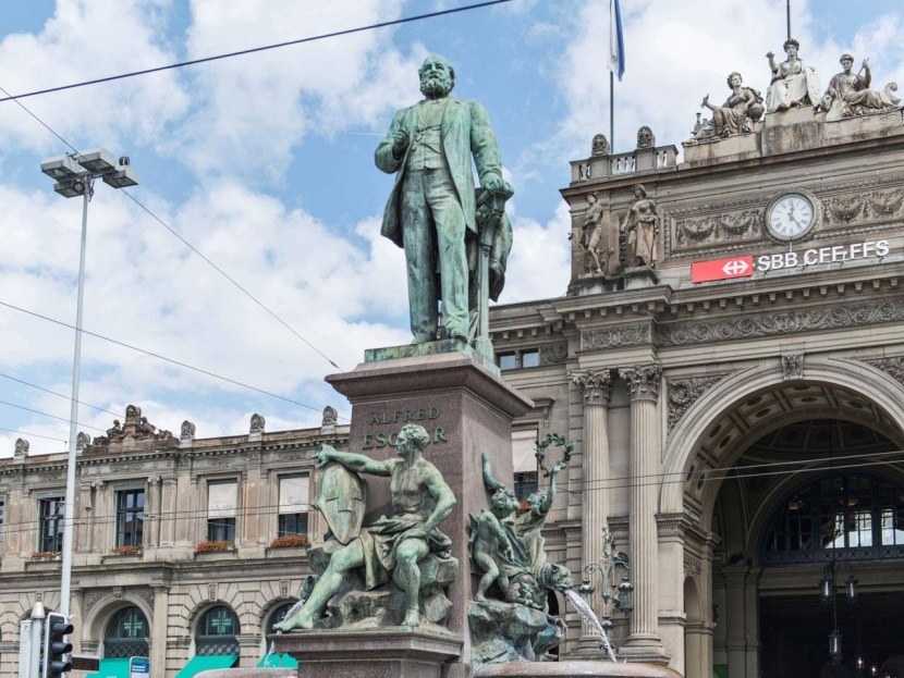 خارج المحطة المركزية في زيوريخ، ينظر تمثال ألفريد إيشر بكل فخر في شارع باهنهوفستراسي، أحد أغلى شوارع التسوق في العالم، إلى باراديبلاتز، قلب الحي المالي في المدينة.
