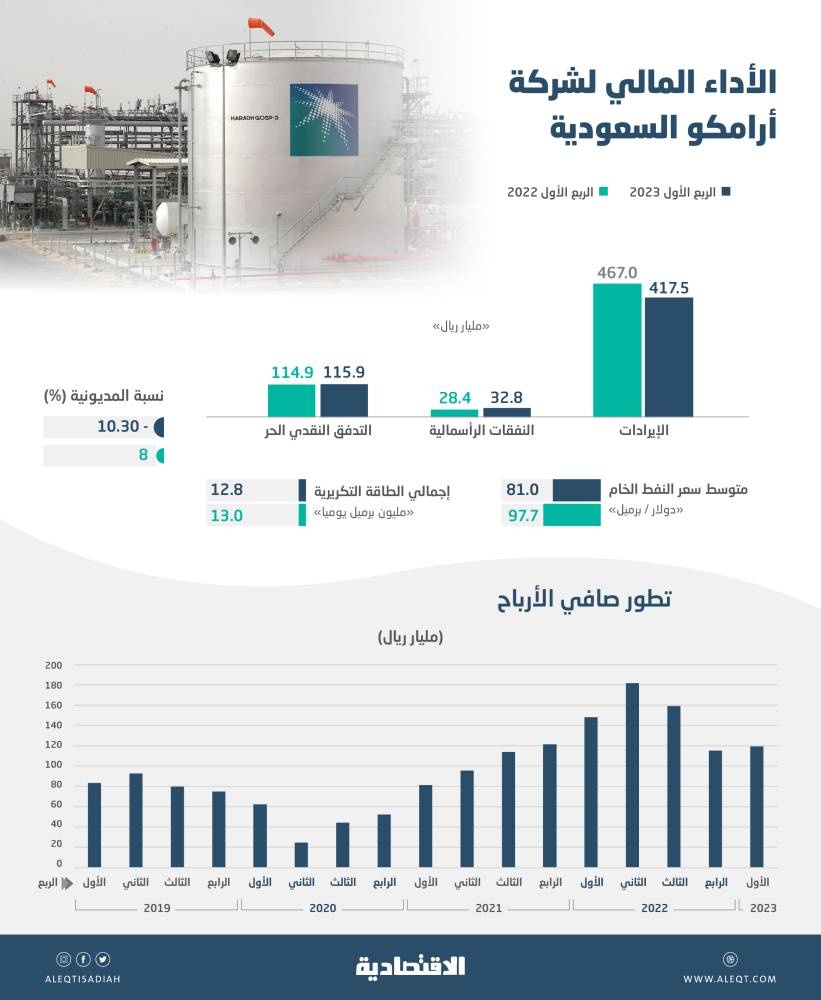 وسجلت الشركة صافي دخل عند 119.5 مليار ريال (31.9 مليار دولار)، مقارنة بنحو 148.03 مليار ريال (39.5 مليار دولار) للفترة ذاتها من 2022، فيما حققت الشركة إيرادات بلغت 417.5 مليار ريال.