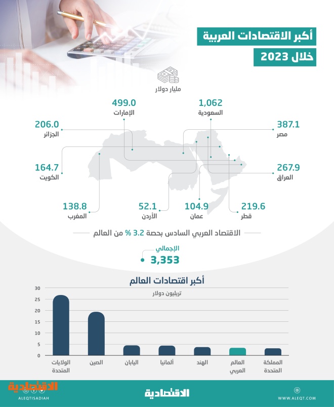 ويتفوق حجم الاقتصاد العربي في 2023 على سادس أكبر اقتصاد في العالم وهو اقتصاد المملكة المتحدة البالغ ناتجه المحلي 3.16 تريليون دولار، فيما يأتي أقل من خامس أكبر اقتصاد في العالم وهو الاقتصاد الهندي البالغ ناتجه 3.74 تريليون دولار.