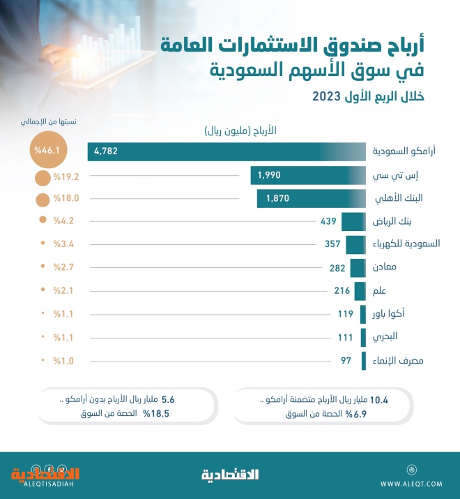 وتشكل أرباح الصندوق (دون أرامكو) 18.5 في المائة من الأرباح الإجمالية للشركات المدرجة في الربع الأول 2023 (30.2 مليار ريال)، مقابل 17.4 في المائة من الربع الأول 2022 (46 مليار ريال).
