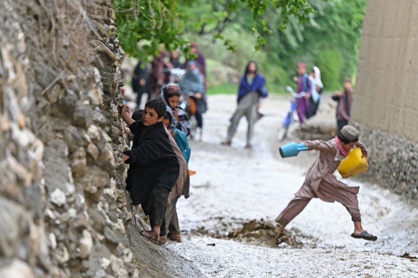 أطفال أفغان يحاولون عبور مجرى لمياه الأمطار التي اجتاحت عدة مناطق في البلاد، ودمرت الفيضانات 20 ألف فدان من الأراضي الزراعية خلال شهر واحد. (الفرنسية).