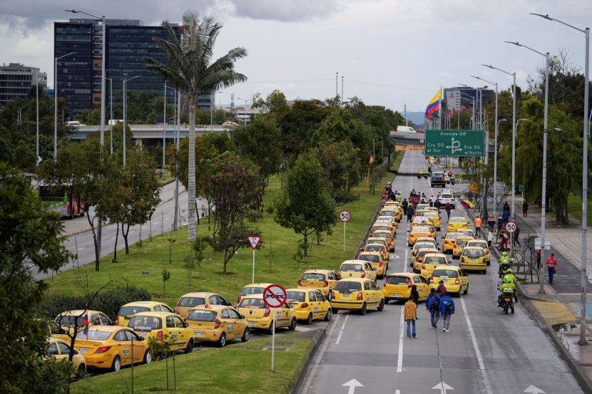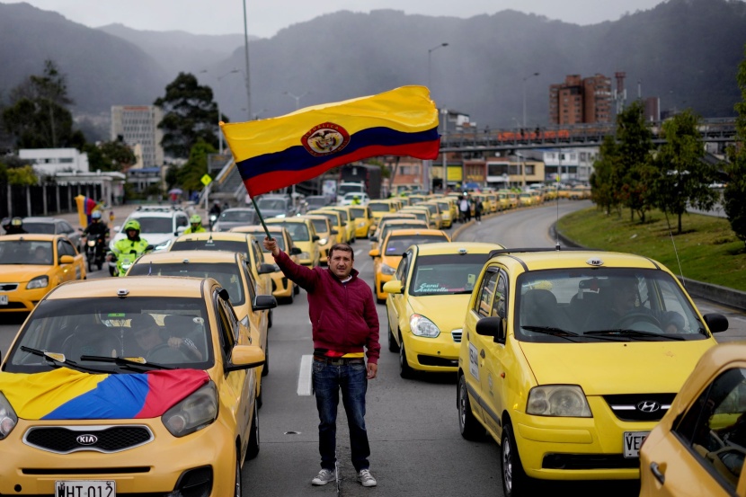 سائقو سيارات الأجرة ينظمون احتجاجا في العاصمة الكولومبية بوغوتا وذلك للضغط على الحكومة لوقف ارتفاع أسعار الوقود. "أ ب"