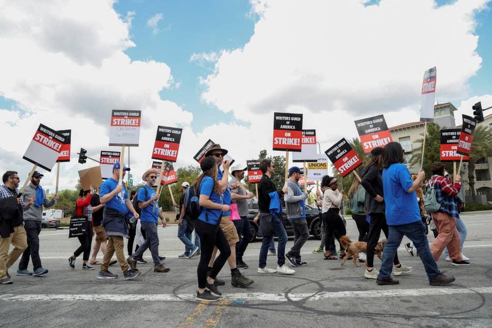 وأثر هذا في الشركات في صناعة الترفيه عالميا. وهذه هي أول مرة تضرب فيها النقابتان منذ 1960. ولم يسفر اجتماع في الأسبوع الماضي بين نقابة الكتاب الأمريكية، وتحالف منتجي الأفلام والتلفزيون، وهي المجموعة التي تمثل الاستوديوهات الكبيرة في المفاوضات، عن أي موعد محدد للعودة إلى طاولة التفاوض.