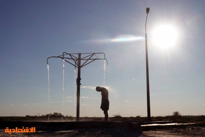كازاخستاني يقف تحت نفاث من المياه المعدنية في حديقة مدينة بايكونور التي تشهد ارتفاعا في درجة الحرارة. «إ.ب.أ »