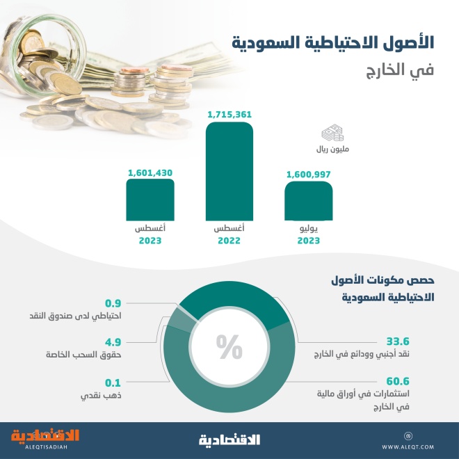 ارتفعت الأصول الاحتياطية السعودية في الخارج بنهاية أغسطس الماضي إلى نحو 1.601 تريليون ريال مقارنة بيوليو السابق له، بزيادة طفيفة 434 مليون ريال.