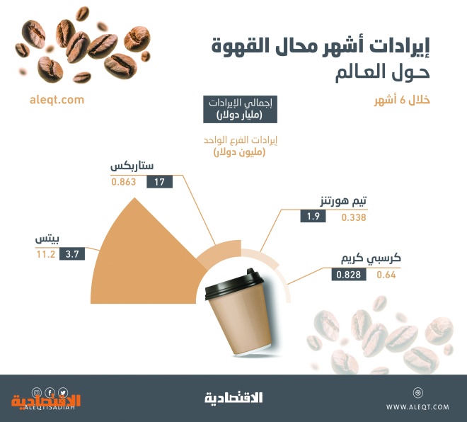 بلغ إجمالي إيرادات أربعة من أشهر محال القهوة 23.4 مليار دولار خلال ستة أشهر من العام الجاري، فيما وصل متوسط الفرع الواحد إلى نحو 3.1 مليون دولار.