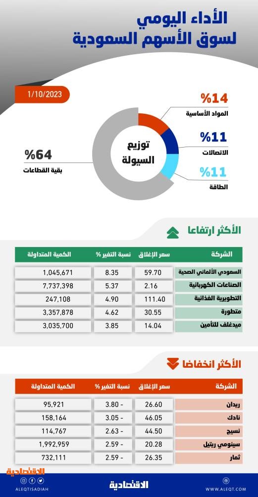 وكان الأعلى تداولا قطاع المواد الأساسية بنحو 14 في المائة بقيمة 573 مليون ريال، يليه "الطاقة" 11 في المائة، ما يمثل 443 مليون ريال، وحل ثالثا "الاتصالات" 11 في المائة بنحو 432 مليون ريال.
