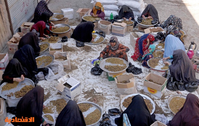عاملات ينظفن ويفرزون الزبيب في سوق بمدينة هيرات غرب أفغانستان، ويعمل الكبير والصغير والرجل والمرأة في مهن مختلفة بالبلاد، لمجابهة قسوة العيش وغلاء المعيشة. (الفرنسية).