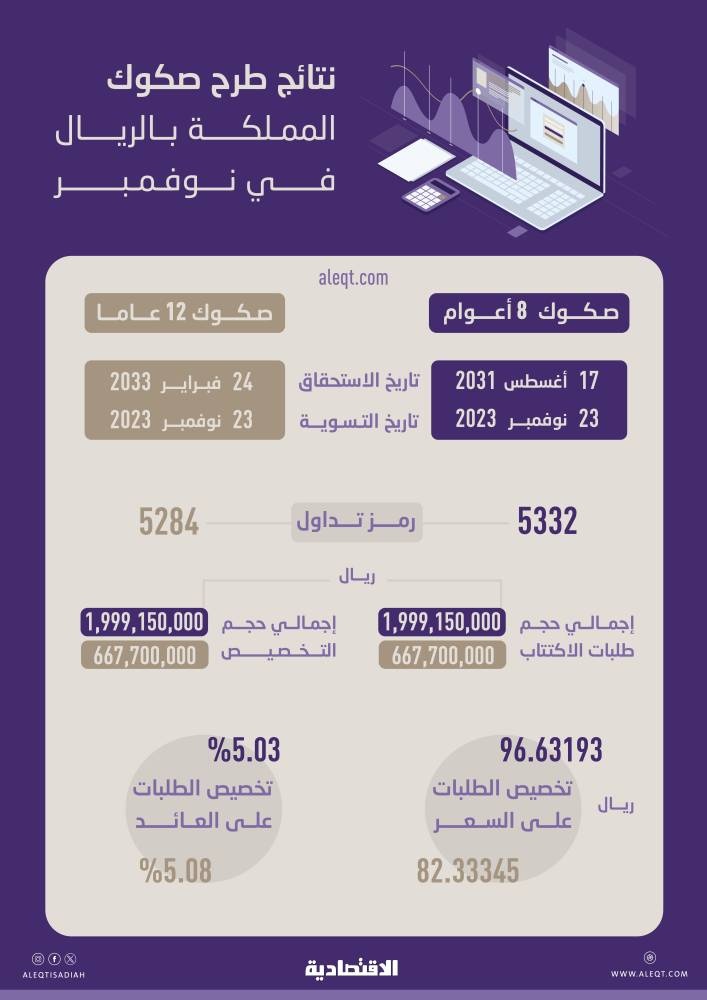 ذكرت وزارة المالية في بيان أن المركز الوطني لإدارة الدين انتهى من استقبال طلبات المستثمرين على إصداره المحلي لشهر نوفمبر 2023، ضمن برنامج صكوك حكومة المملكة بالريال، إذ تم تحديد إجمالي حجم التخصيص بمبلغ قدره 2.667 مليار ريال.