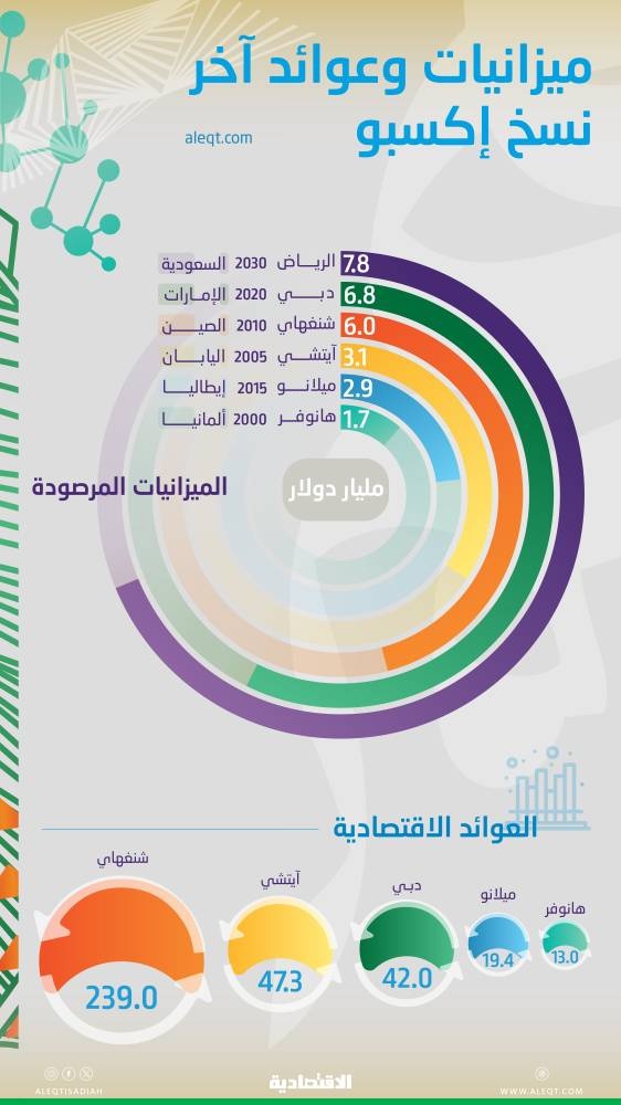 وعلى سبيل المثال، بلغ العائد المباشر من نسخة إكسبو شنغهاي 12 مليار دولار، بينما الأثر الاقتصادي للمعرض بلغ 239 مليار دولار، وهو ما ينطبق على بقية النسخ.