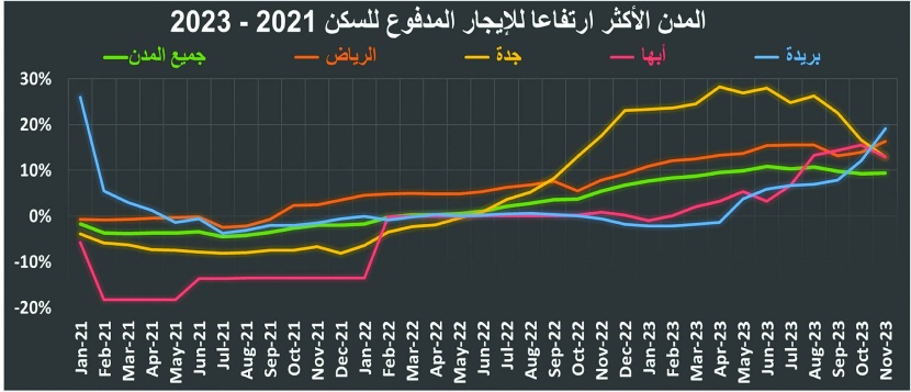بينما صعدت مدينة الرياض من المرتبة الثالثة خلال الشهر الأسبق إلى المرتبة الثانية، بارتفاع إيجار السكن فيها بمعدل سنوي 16.4 في المائة، مقارنة بارتفاعه خلال الشهر الأسبق 14.0 في المائة، مدفوعا بالارتفاع القياسي لإيجار البيوت الشعبية بمعدل سنوي 31.0 في المائة، ثم ارتفاع إيجار أدوار الفلل السكنية بمعدل سنوي 26.6 في المائة (يعد أعلى ارتفاع لإيجار أدوار الفلل في المملكة)، ثم ارتفاع إيجار الشقق السكنية بمعدل سنوي 16.4 في المائة. وتراجعت مدينة أبها من المرتبة الثانية خلال الشهر الأسبق إلى المرتبة الثالثة، وسجل إيجار السكن في أبها ارتفاعا سنويا 12.9 في المائة، مقارنة بارتفاعه الأسبق 15.5 في المائة، مدفوعا بارتفاع إيجار البيوت الشعبية بمعدل سنوي قياسي 46.8 في المائة (يعد أعلى ارتفاع لإيجار البيوت الشعبية في المملكة)، ثم ارتفاع إيجار الشقق السكنية بمعدل سنوي 31.6 في المائة (ثاني أعلى ارتفاع لإيجار الشقق في المملكة)، وأخيرا ارتفاع إيجار أدوار الفلل السكنية بمعدل سنوي 16.1 في المائة.