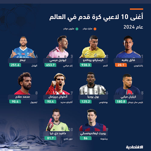 قفزت ثروات أغنى 10 لاعبي كرة القدم في العالم خلال عام 2024 وصلت إلى ما يقارب 22.5 مليار دولار بفضل عقود الرعاية واتفاقيات الشراكة مع العلامات التجارية إضافة إلى الرواتب العالية مع أنديتهم. وبحسب موقع "sportune" المختص بالمعلومات والتحليلات الرياضية العالمية، أصبح البرتغالي كريستيانو رونالدو مهاجم فريق النصر لكرة القدم هو ثاني أغنى لاعب كرة قدم في العالم عام 2024 بثروة تقدر بـ (930.3 مليون دولار).