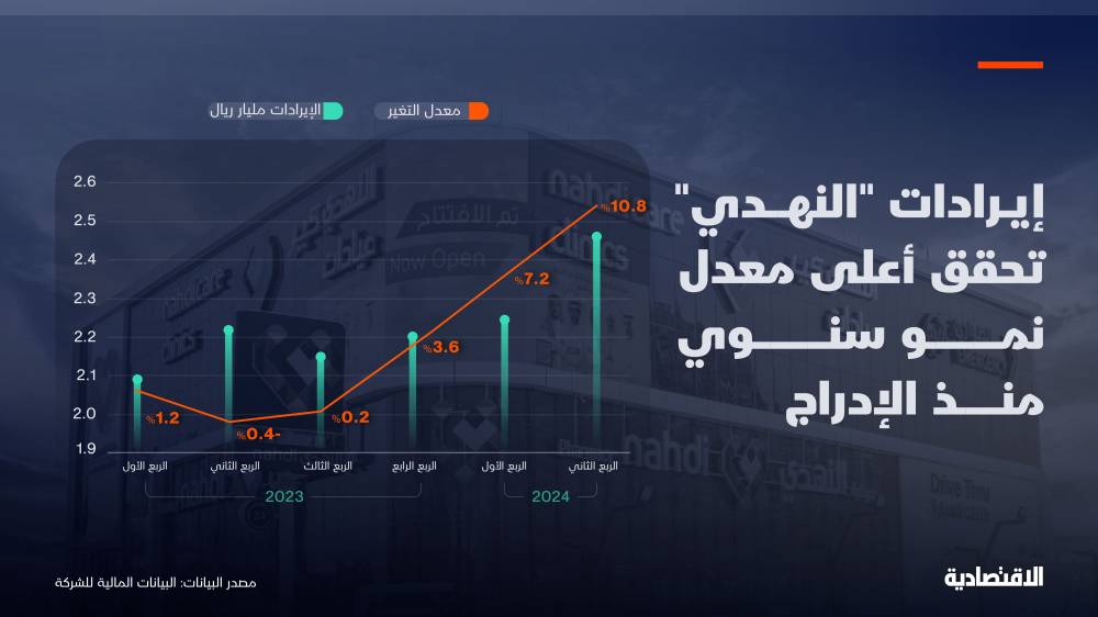 ارتفعت إيرادات شركة النهدي بنحو 10.8% خلال الربع الثاني من العام الجاري لتسجل أعلى معدل نمو سنوي منذ إدراجها في السوق السعودية، لتصل لمستوى قياسي عند 2.47 مليار ريال.