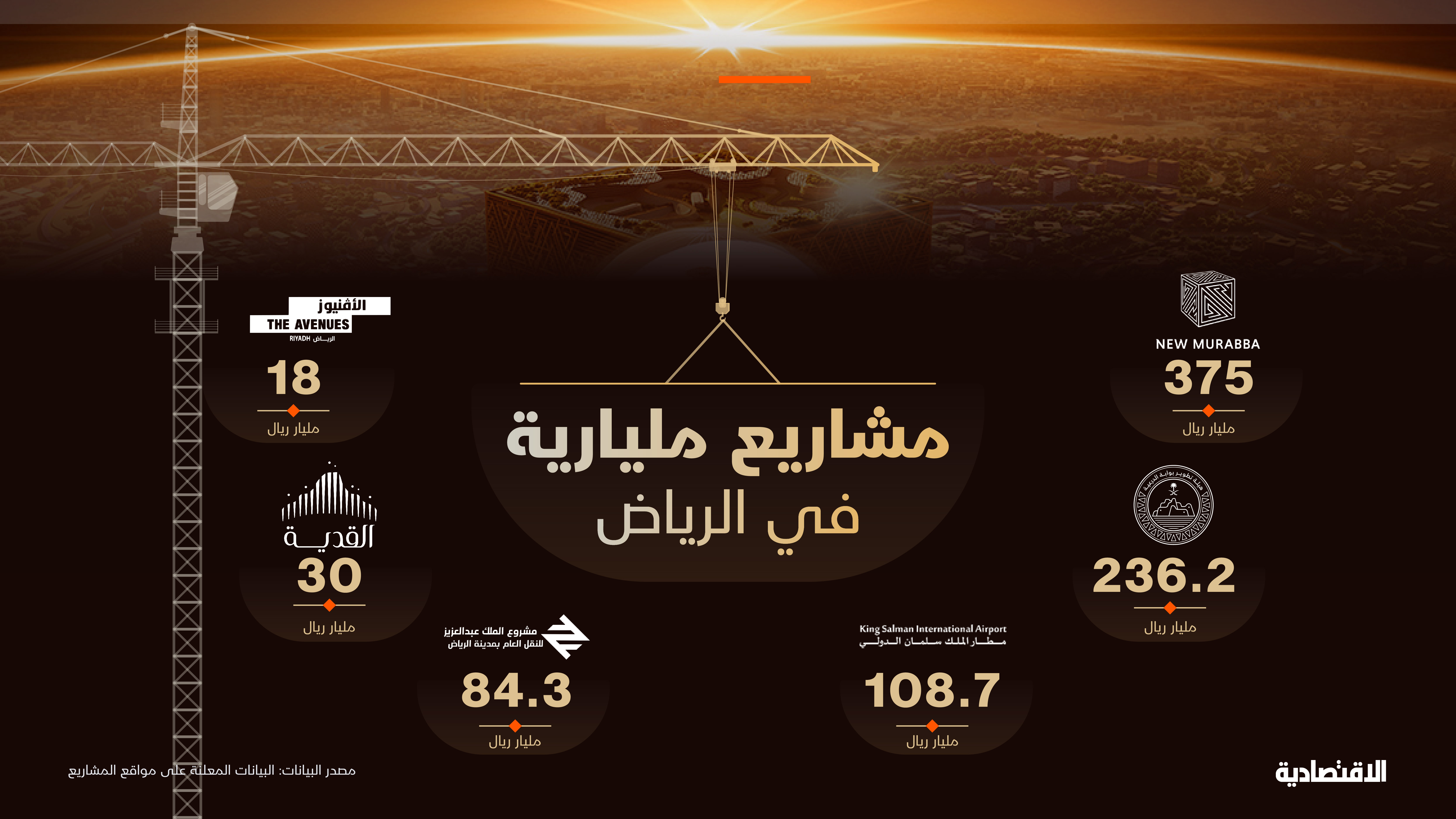 فيما تبلغ تكلفة مشروع الملك عبدالعزيز للنقل العام 84.3 مليار ريال، ومطار الملك سلمان 108.7 مليار ريال وأفنيوز الرياض 16 مليار ريال، فيما تصل تكلفة مشروع المربع إلى 375 مليار ريال، بحسب بيانات معلنة.