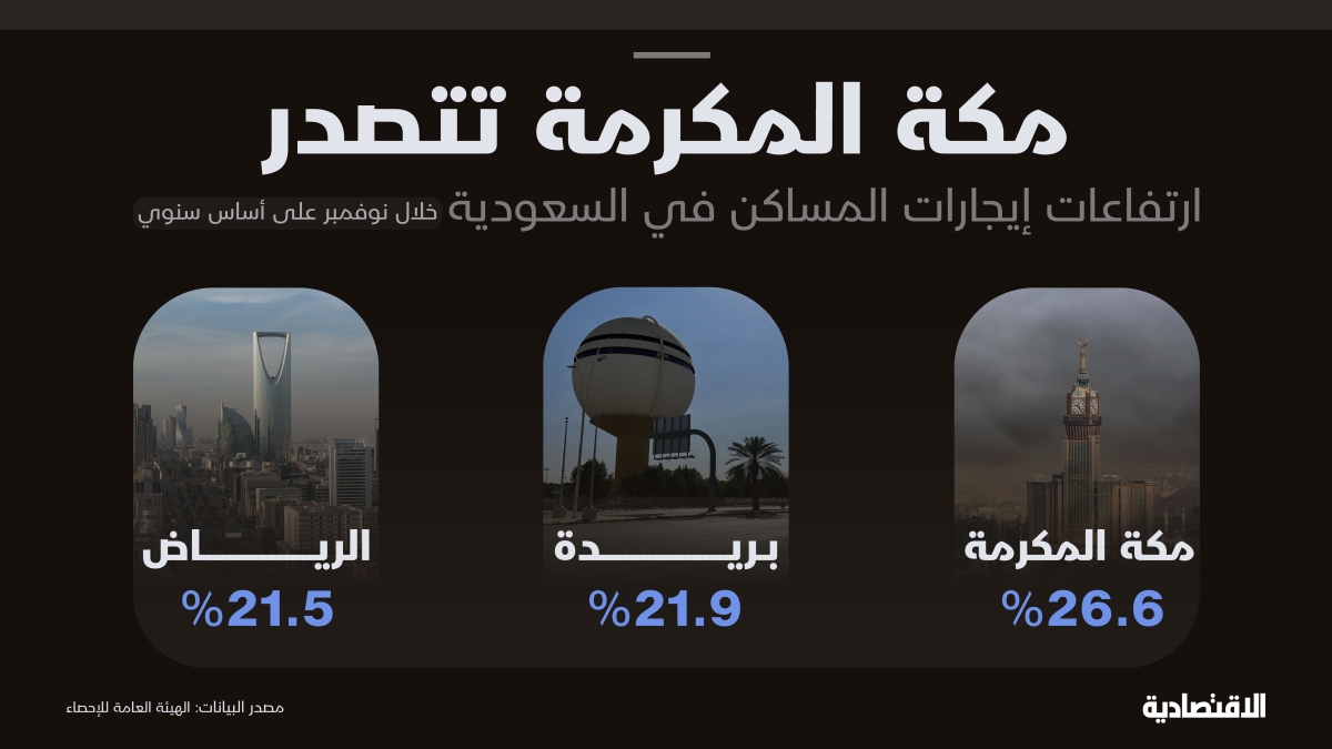 على غير العادة، تصدرت مكة المكرمة الارتفاعات في إيجارات المساكن في المدن السعودية خلال نوفمبر بـ 26.6 %، ثم بريدة والرياض بـ 21.9 % و21.5 % على التوالي، فيما شهدت ثلاث مدن تراجعا في الأسعار هي سكاك وأبها والهفوف بنسب – 7.3 % -1.9 % و - 1.7 % على الترتيب.