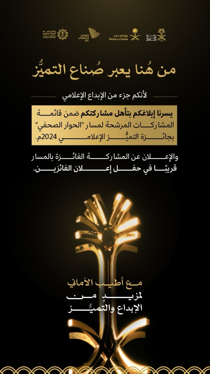 تأهلت صحيفة "الاقتصادية" إلى المرحلة النهائية ضمن قائمة المشاركات المرشحة لمسار الحوار الصحافي لجائزة التميز الإعلامي في نسختها الخامسة 2024 التي تنظمها وزارة الإعلام السعودية بالشراكة مع برنامج "تنمية القدرات البشرية" أحد برامج تحقيق رؤية المملكة 2030، والمقرر إعلانها خلال حفل رسمي يحضره وزير الإعلام سلمان الدوسري وعدد من المسؤولين الإثنين المقبل.
