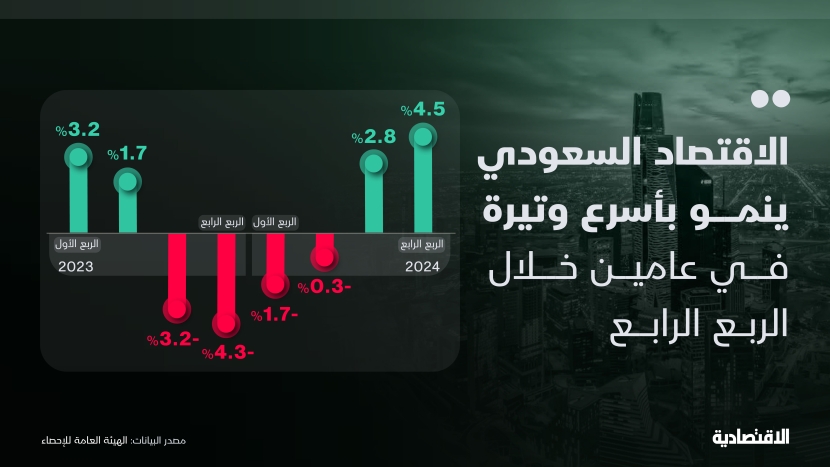 في الربع الرابع 2024، تسارع نمو الاقتصاد السعودي إلى 4.5% على أساس سنوي، ما يعد أسرع وتيرة نمو خلال عامين، كما أنه ثاني نمو ربعي على التوالي، بعد 4 فصول من الانكماش.