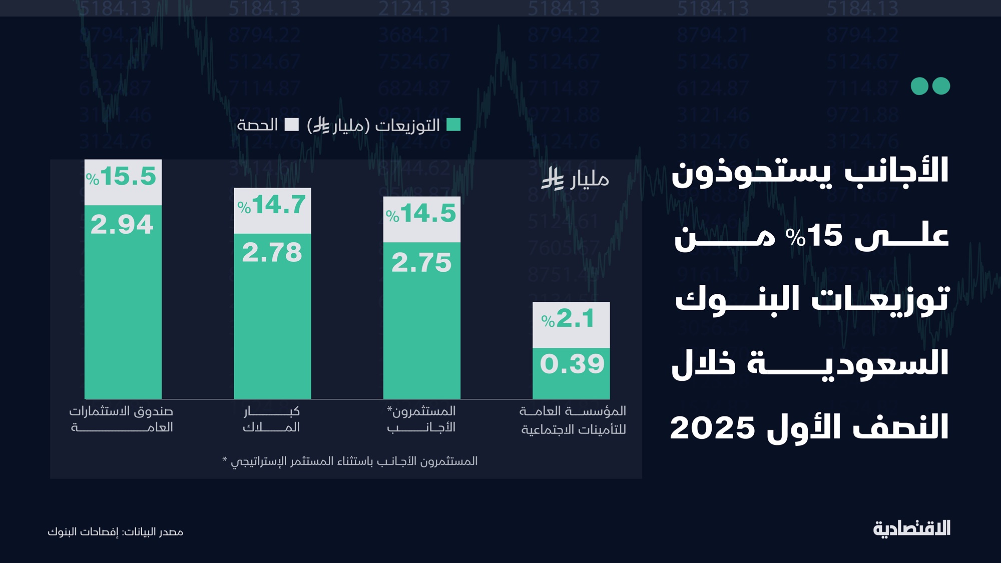 يمثل التوزيع النقدي المعلن للبنوك عن النصف الأول عائدا سنويا يقدر بنحو 4%، وهو أعلى بشكل طفيف من عائد السوق البالغ 3.9 %، بحسب بلومبرغ.